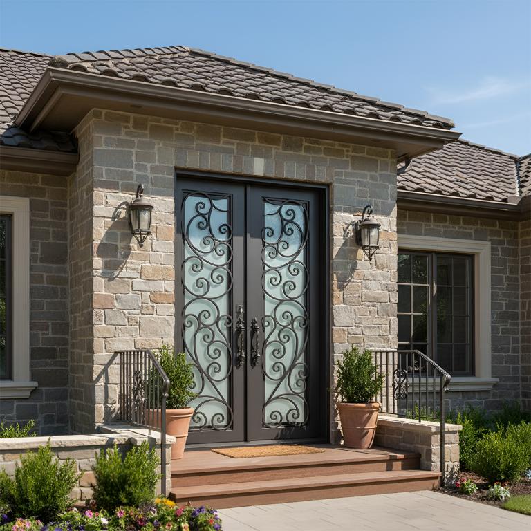 | TUSCANY LH Wrought Iron Door 61 X 96 LEFT HAND INSWING MEDIUM COPPER Color SANDBLAST Glass STEEL Material PULL HANDLE #019 SQUARE DEADBOLT DOUBLE SQUARE TOP Mediterranean, Spanish, Italianate Style Residential, Commercial (Pull Handles and Locks are price separately) | |