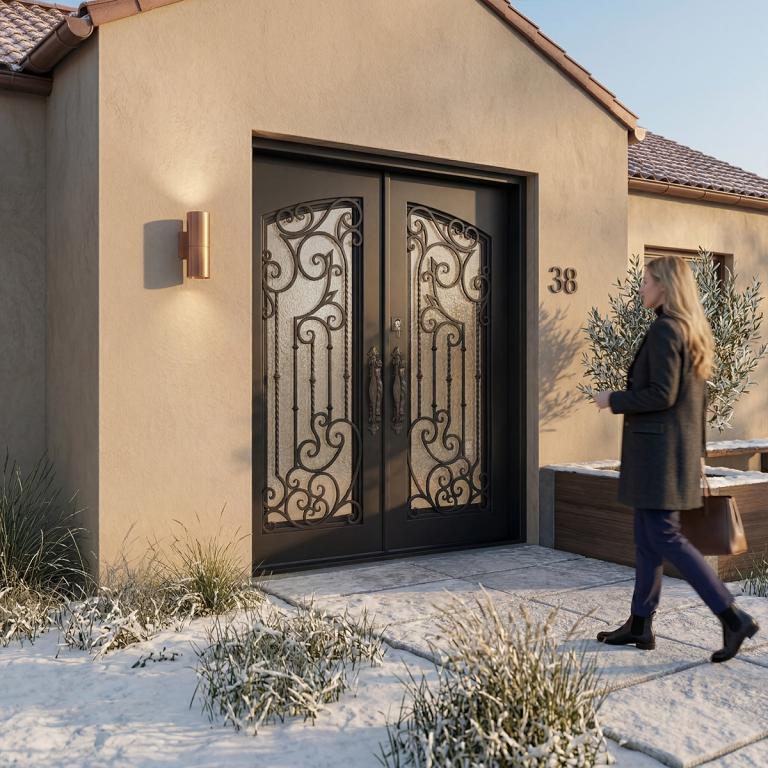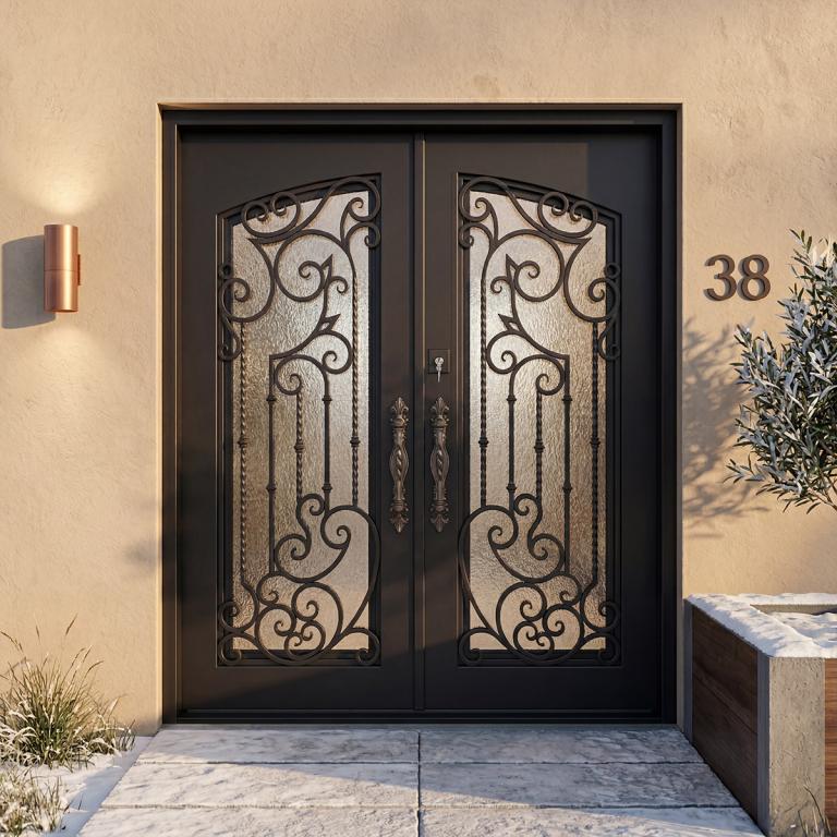 | TAMPA THERMAL BREAK LH WROUGHT IRON Style 72 X 81 LEFT HAND INSWING MEDIUM COPPER Color RAIN Glass STEEL Material PULL HANDLE #019 VITO - D107 - BL - S - DOUBLE SQUARE TOP Mediterranean, Spanish, Italianate Style wScreen, Thermal Break, Residential, Commercial (Pull Handles and Locks are price separately) | |