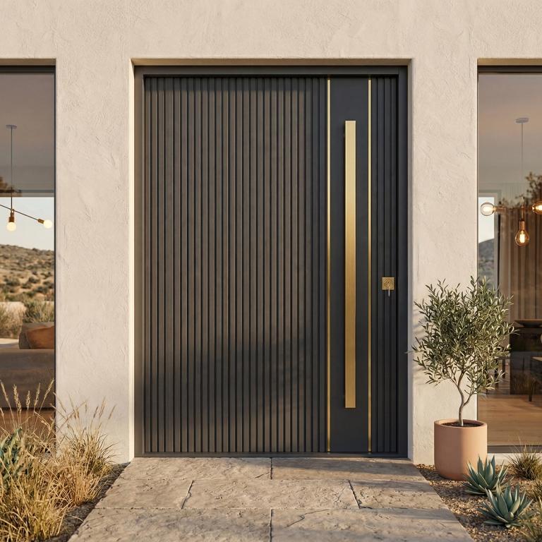 | VERMONT PIVOT RH Metal Pivot Door 61 X 96 RIGHT HAND INSWING FLAT BLACK Color ALUMINUM Material PULL HANDLE #066 BRUSHED GOLD SQUARE SQUARE DEADBOLT 8469 - SINGLE CYLINDER (SATIN BRASS (US4)) SINGLE SQUARE TOP Modern, Contemporary Style solid, Residential, Commercial (Pull Handles and Locks are price separately) | |