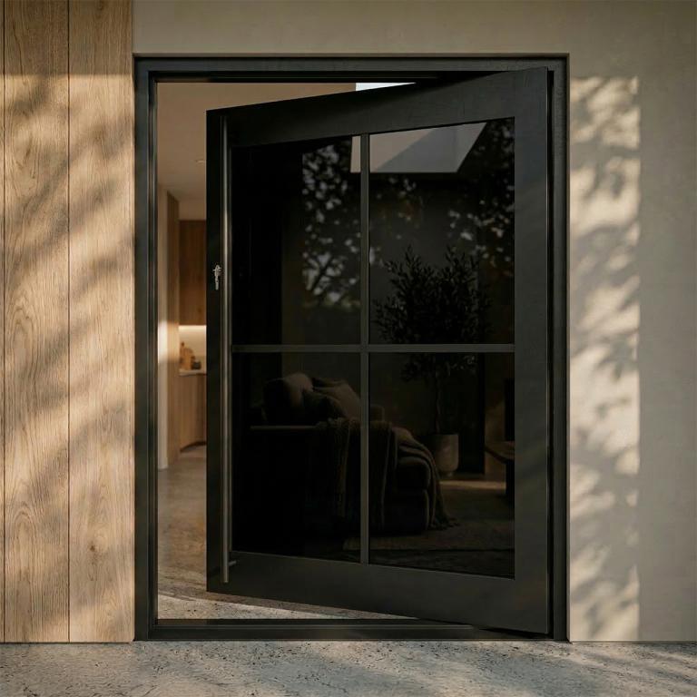 | PEACE BLACK PIVOT RH PIVOT Style 61 X 81 RIGHT HAND INSWING FLAT BLACK Color BLACK OVER BLACK Glass STEEL Material PULL HANDLE #038 VITO - D107 - BL - S - SINGLE SQUARE TOP Modern, Contemporary Style Residential, Commercial (Pull Handles and Locks are price separately) | |