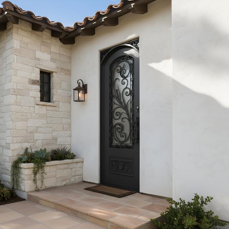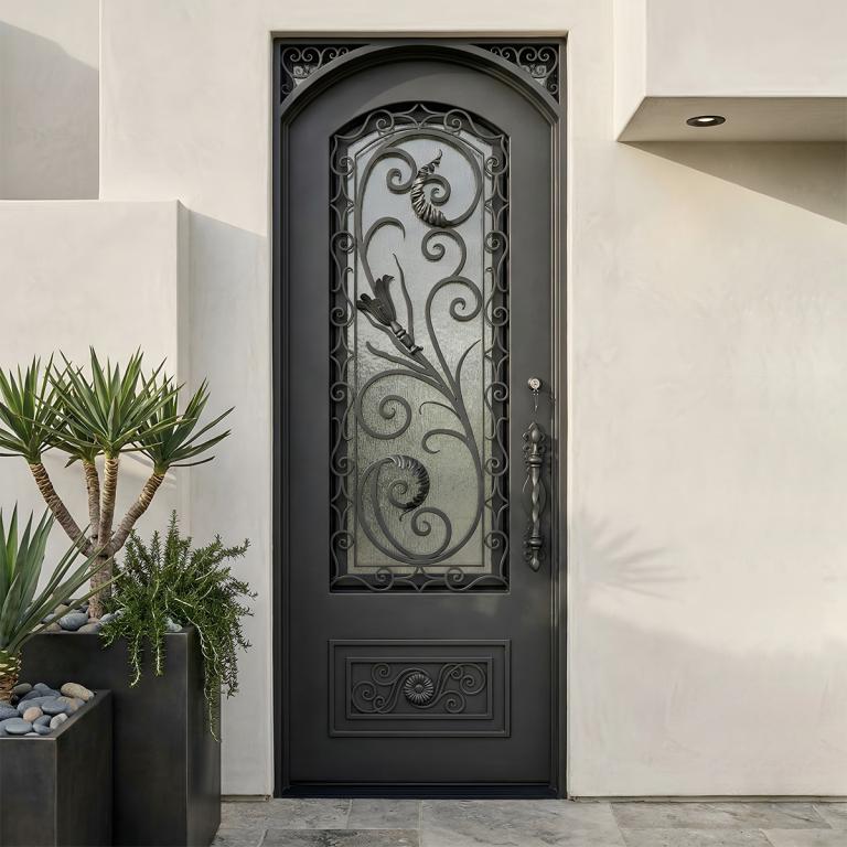 | RENAISSANCE LH WROUGHT IRON Style 37 X 96 LEFT HAND INSWING DARK COPPER Color RAIN Glass STEEL Material PULL HANDLE #019 SINGLE SQUARE TOP Mediterranean, Spanish, Italianate Style wScreen (Pull Handles and Locks are price separately) | |