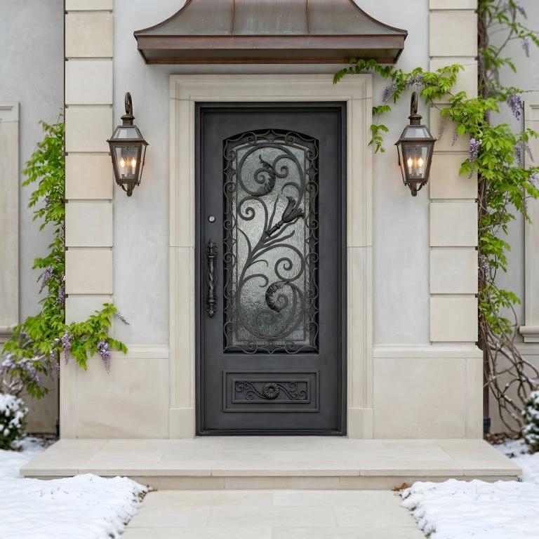 | RENAISSANCE THERMAL BREAK LH WROUGHT IRON Style 37 X 81 LEFT HAND INSWING DARK COPPER Color RAIN Glass STEEL Material PULL HANDLE #019 SINGLE SQUARE TOP Mediterranean, Spanish, Italianate Style wScreen, Thermal Break (Pull Handles and Locks are price separately) | |