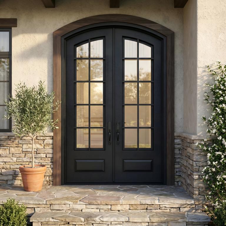 | CUSTOM #1044 PK136 WROUGHT IRON Style 74 X 124 RIGHT HAND INSWING MATTE BLACK (01) Color SANDBLAST + CLEAR Glass ROCCO - 9601-ORB- ET - ACTIVE EYEBROW TOP Modern, Contemporary Style (Pull Handles and Locks are price separately) | |