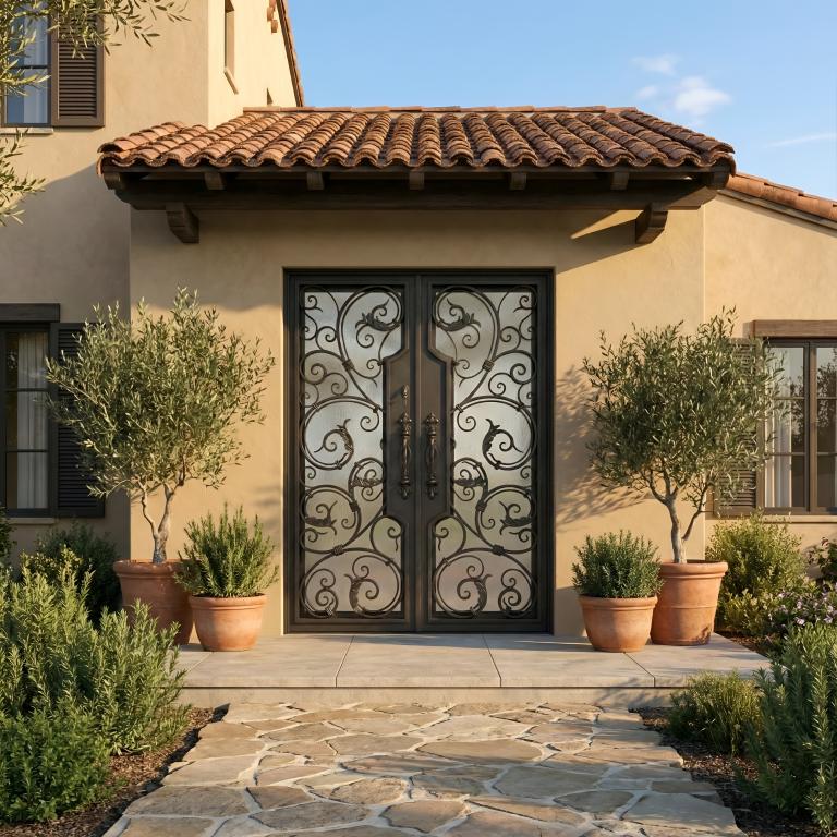 | CHARLOTTE LH WROUGHT IRON Style 61 X 81 LEFT HAND INSWING FLAT BLACK Color RAIN Glass STEEL Material PULL HANDLE #019 VITO - D107 - BL - S - DOUBLE SQUARE TOP Mediterranean, Spanish, Italianate Style wScreen (Pull Handles and Locks are price separately) | |