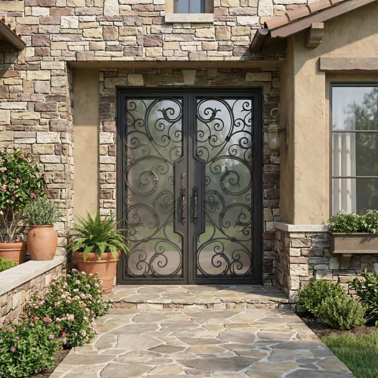 | CHARLOTTE RH WROUGHT IRON Style 72 X 96 RIGHT HAND INSWING FLAT BLACK Color RAIN Glass STEEL Material PULL HANDLE #019 VITO - D107 - BL - S - DOUBLE SQUARE TOP Mediterranean, Spanish, Italianate Style wScreen (Pull Handles and Locks are price separately) | |