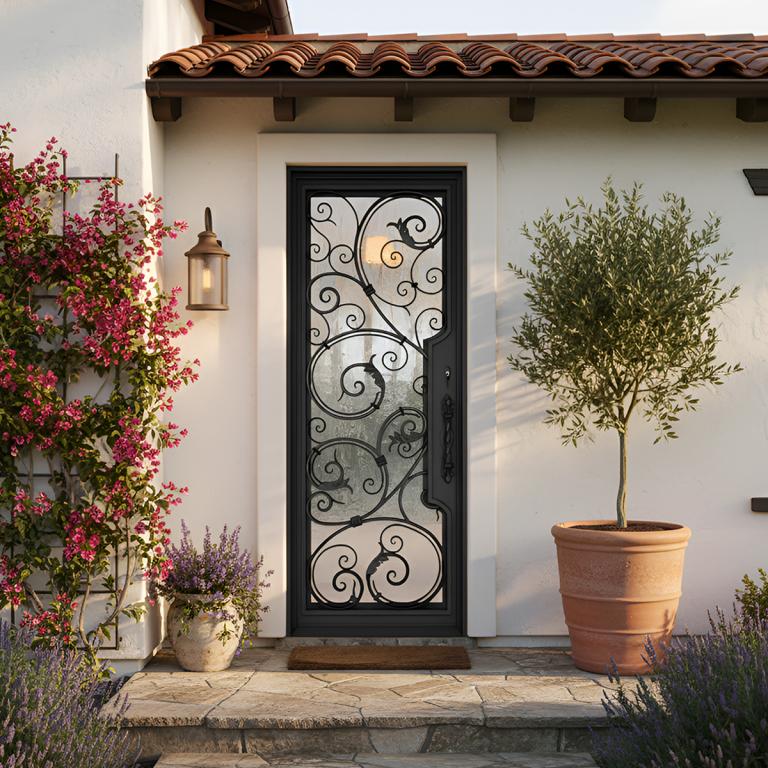 | CHARLOTTE RH WROUGHT IRON Style 37 X 96 RIGHT HAND INSWING FLAT BLACK Color RAIN Glass STEEL Material PULL HANDLE #019 VITO - D107 - BL - S - SINGLE SQUARE TOP Mediterranean, Spanish, Italianate Style wScreen (Pull Handles and Locks are price separately) | |