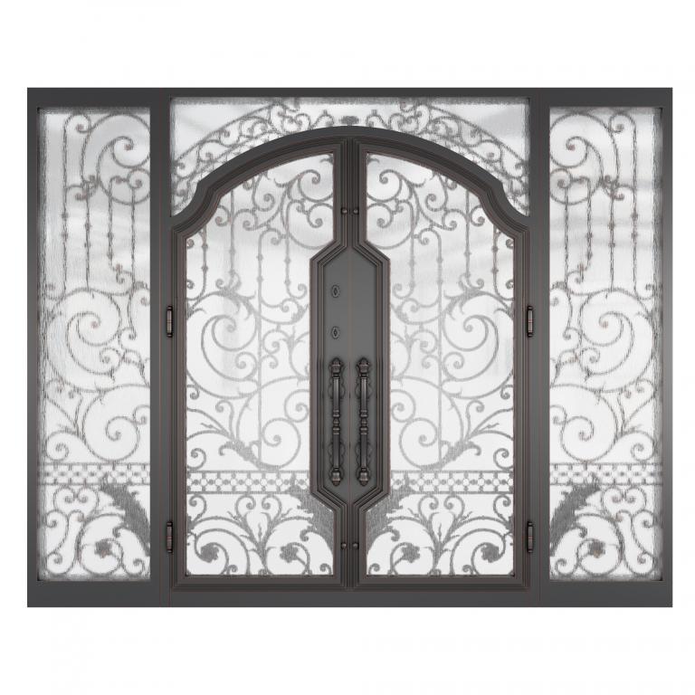 HOVER DOOR WITH SIDELIGHT #R WROUGHT IRON Style 128 X 101 RIGHT HAND INSWING FLAT BLACK Color REFLECTIVE + RAIN Glass STEEL Material PULL HANDLE #046 SIROCCO - D109 - ORB - SINGLE CYLINDER, SIROCCO - D109 - ORB - DOUBLE CYLINDER DOUBLE SQUARE TOP Mediterranean, Spanish, Italianate Style wSidLights, wScreen, special, clearance (Pull Handles and Locks are price separately) | |