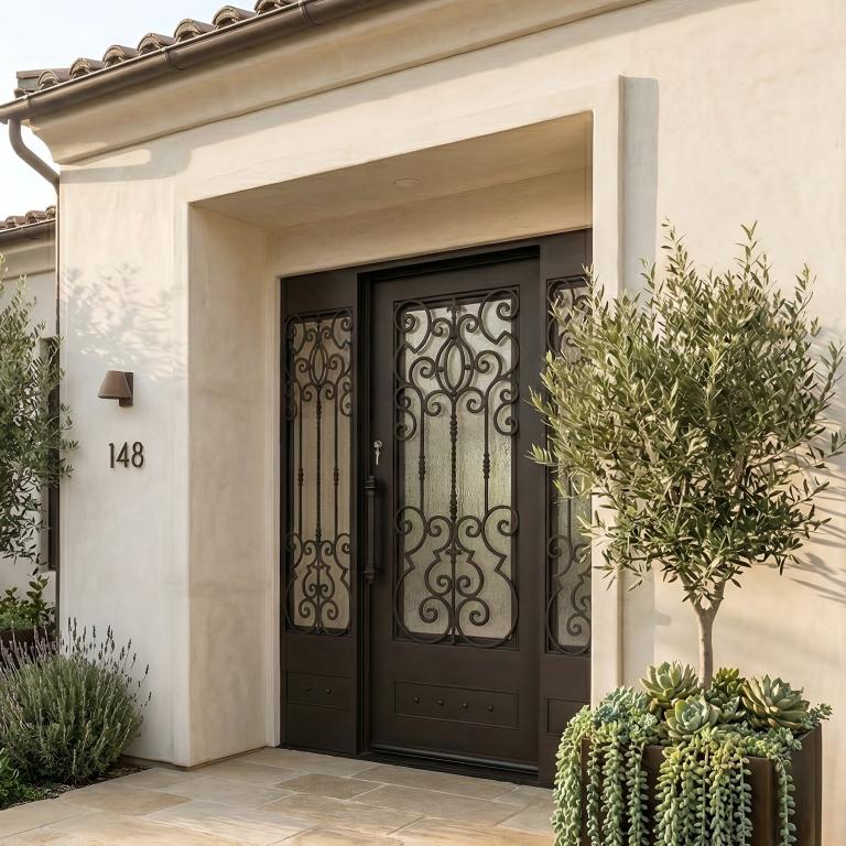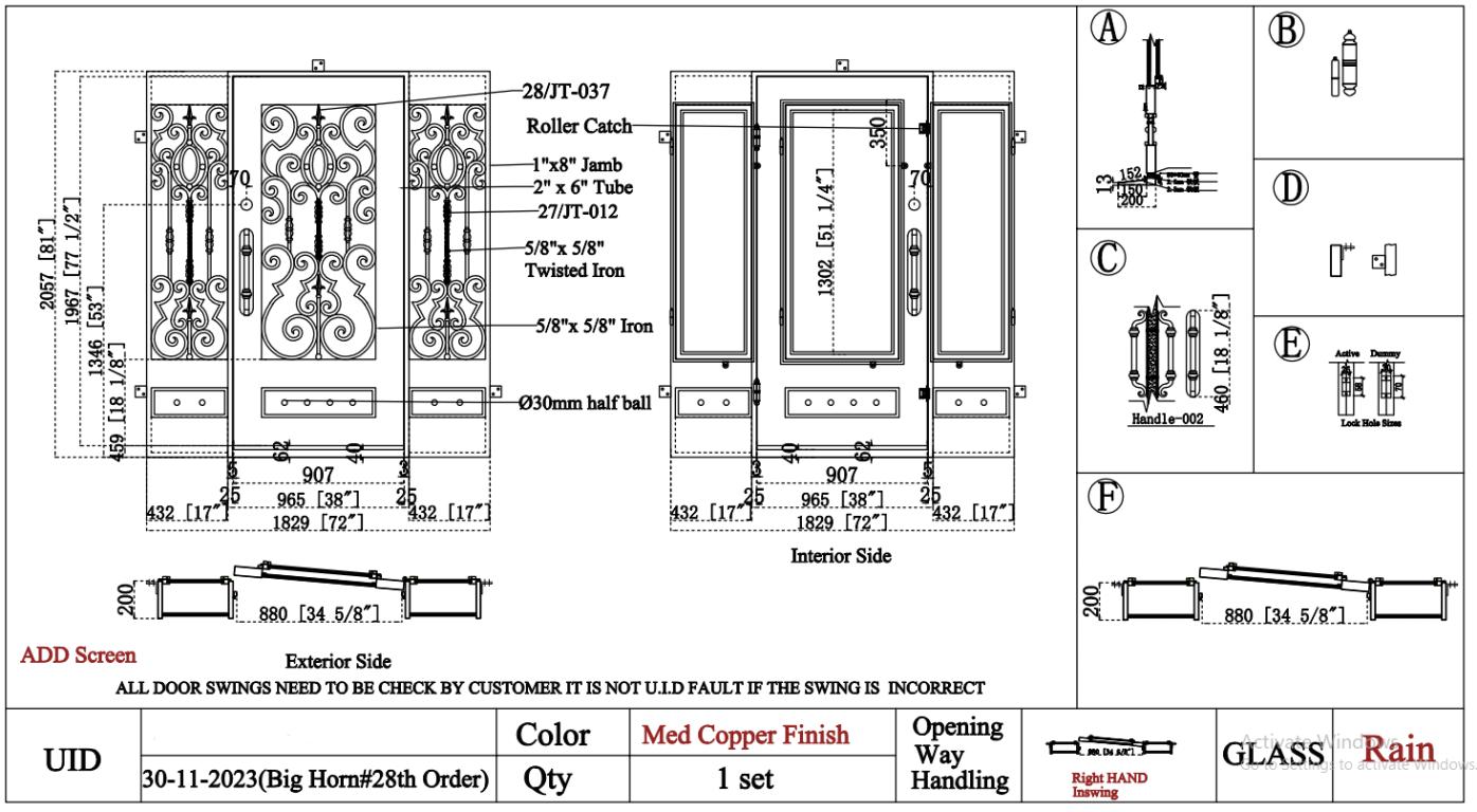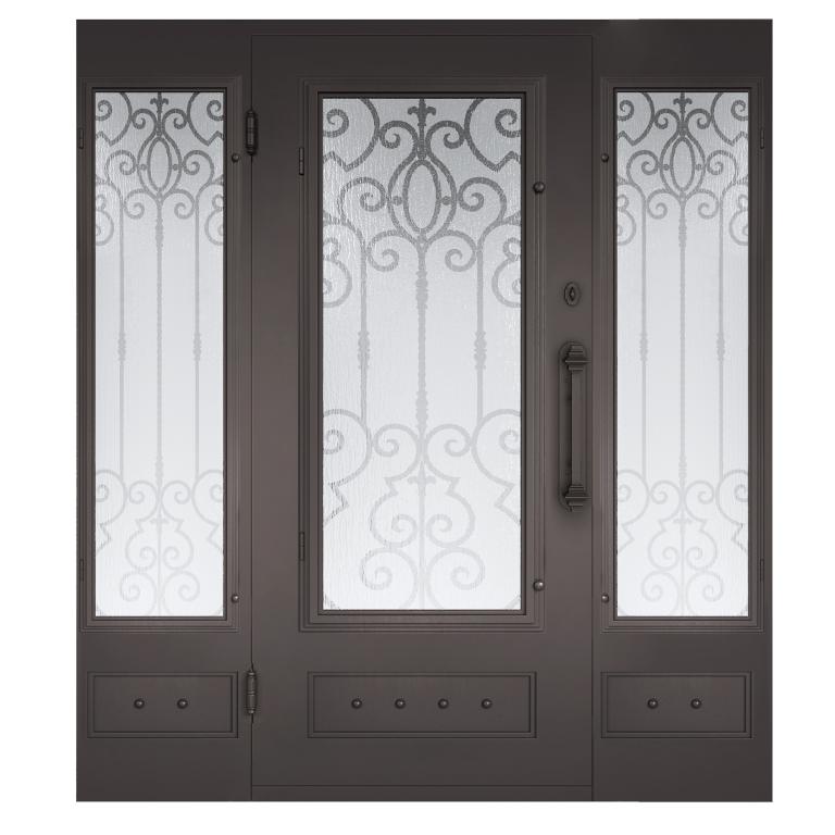 | ANGELINO RH WITH SIDELIGHTS 1X8 JAMB #R WROUGHT IRON Style 72 X 81 RIGHT HAND INSWING MEDIUM COPPER Color RAIN Glass STEEL Material PULL HANDLE #002 SIROCCO - D109 - ORB - SINGLE CYLINDER SINGLE SQUARE TOP Mediterranean, Spanish, Italianate Style wSidLights, wScreen (Pull Handles and Locks are price separately) | |