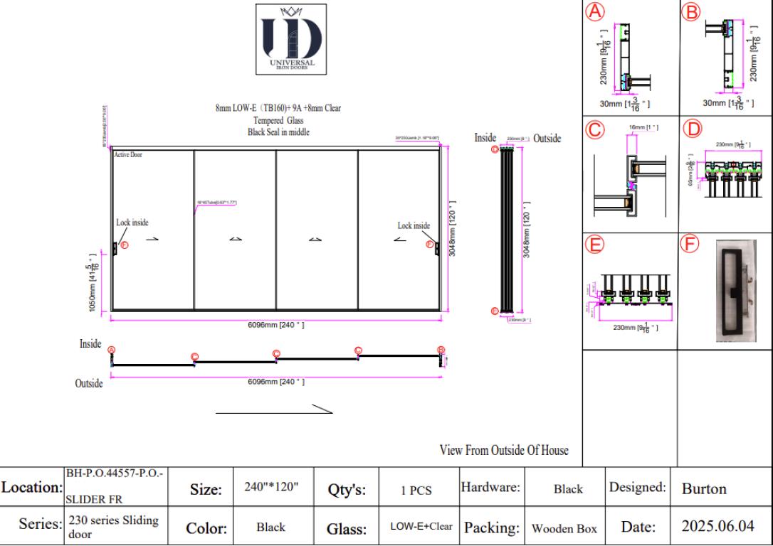 | ALUMINUM SLIDING DOOR SR #R INTERIOR DOOR ALUMINIUM SLIDING Style 240 X 120 SLIDING FLAT BLACK Color LOW-E CLEAR Glass ALUMINUM Material SQUARE TOP Modern, Contemporary Style Thermal Break | |