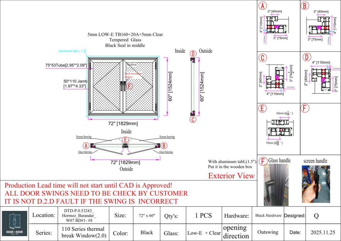 ESSEX THERMAL BREAK EYEBROW RH WROUGHT IRON Style 61 X 81 RIGHT HAND INSWING FLAT BLACK Color RAIN Glass STEEL Material PULL HANDLE #006 VITO - D107 - BL - S - DOUBLE SQUARE TOP Farmhouse, Craftsman, Cape Cod Style wScreen, Thermal Break, Residential, Commercial (Pull Handles and Locks are price separately)