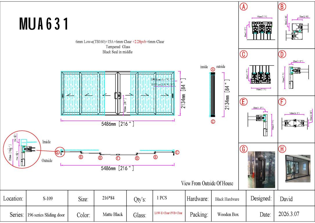 | ALUMINUM SLIDING DOOR WITH IMPACT GLASS (PVB) SM ALUMINIUM SLIDING Style 216 X 84 SLIDING FLAT BLACK Color LOW-E CLEAR - PVB CLEAR (IMPACT) Glass ALUMINUM Material SQUARE TOP Modern, Contemporary Style Thermal Break, special, clearance | |