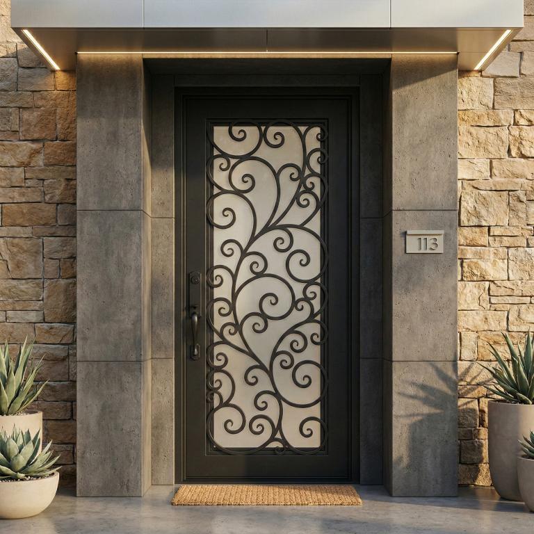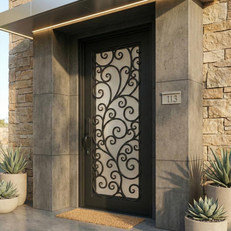 | TUSCANY RH WROUGHT IRON Style 42 X 96 RIGHT HAND INSWING DARK COPPER Color SANDBLAST Glass STEEL Material PULL HANDLE #019 VITO - D107 - BL - S - SINGLE SQUARE TOP Mediterranean, Spanish, Italianate Style wScreen, solid, Residential, Commercial (Pull Handles and Locks are price separately) | |