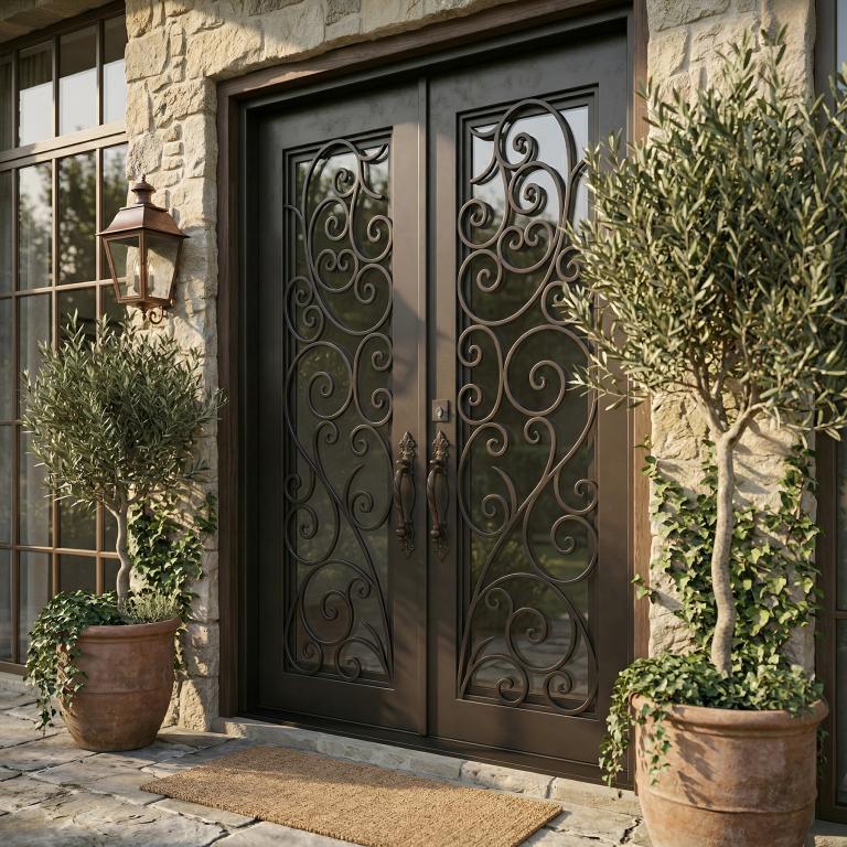 | TUSCANY RH WROUGHT IRON Style 61 X 81 RIGHT HAND INSWING MEDIUM COPPER Color SANDBLAST Glass STEEL Material PULL HANDLE #018 VITO - D107 - BL - S - DOUBLE SQUARE TOP Mediterranean, Spanish, Italianate Style wScreen, Residential, Commercial (Pull Handles and Locks are price separately) | |
