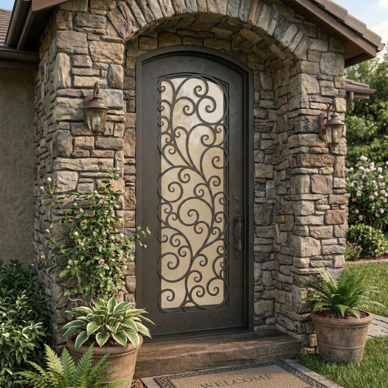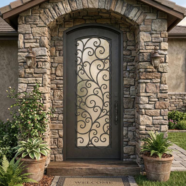 | TUSCANY LH Wrought Iron Door 42 X 96 LEFT HAND INSWING MEDIUM COPPER Color SANDBLAST Glass STEEL Material PULL HANDLE #019 SQUARE DEADBOLT SINGLE EYEBROW TOP Mediterranean, Spanish, Italianate Style solid, Residential, Commercial (Pull Handles and Locks are price separately) | |