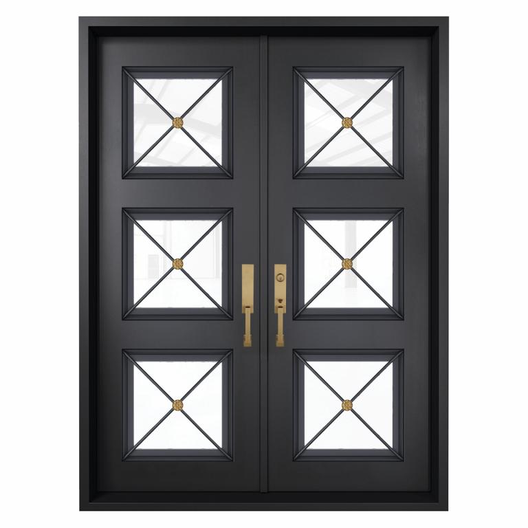| REFLECTION RH Wrought Iron Door 72 X 81 RIGHT HAND INSWING FLAT BLACK Color SANDBLAST Glass STEEL Material PULL HANDLE #006 SQUARE DEADBOLT DOUBLE SQUARE TOP Modern Style Residential, Commercial (Pull Handles and Locks are price separately) | |
