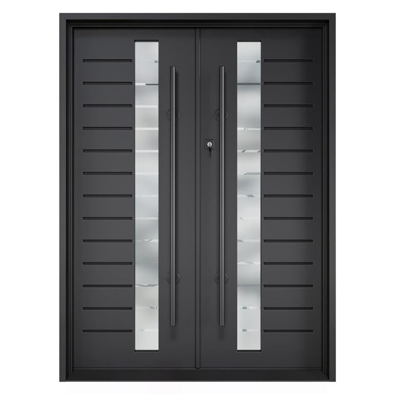 ART RH WROUGHT IRON Style 72 X 96 RIGHT HAND INSWING FLAT BLACK Color SANDBLAST Glass STEEL Material PULL HANDLE #038 VITO - D107 - BL - S - DOUBLE SQUARE TOP Modern, Contemporary Style (Pull Handles and Locks are price separately)