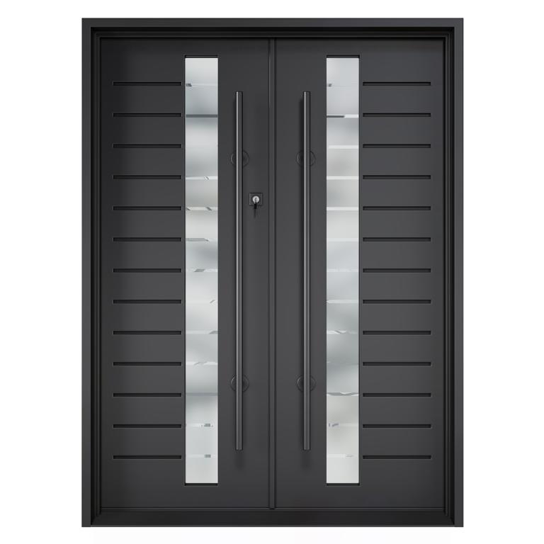 ART RH WROUGHT IRON Style 72 X 96 RIGHT HAND INSWING FLAT BLACK Color SANDBLAST Glass STEEL Material PULL HANDLE #038 VITO - D107 - BL - S - DOUBLE SQUARE TOP Modern, Contemporary Style (Pull Handles and Locks are price separately)