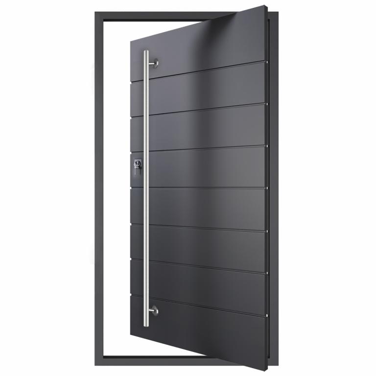 THE BEAST 2 RH PIVOT #R WROUGHT IRON Style 48 X 81 RIGHT HAND INSWING FLAT BLACK Color SANDBLAST Glass STEEL Material PULL HANDLE #037 VITO - D107 - SN - S - SINGLE SQUARE TOP Modern, Contemporary Style clearance (Pull Handles and Locks are price separately)