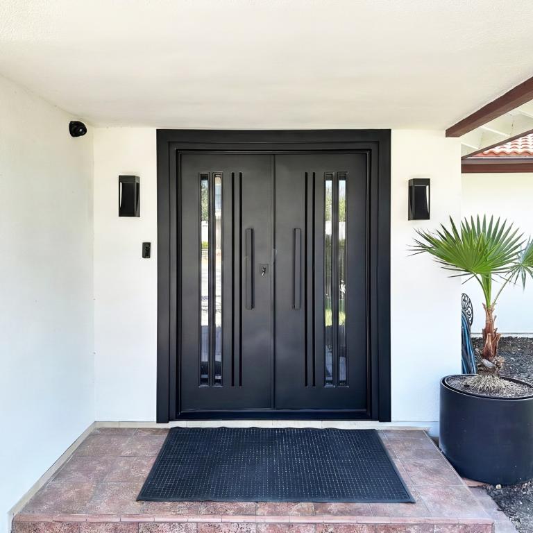 | DOLCE RH WROUGHT IRON Style 61 X 81 RIGHT HAND INSWING FLAT BLACK Color REEDED Glass STEEL Material PULL HANDLE #006 VITO - D107 - BL - S - DOUBLE SQUARE TOP Modern, Contemporary, Art Deco Style Residential, Commercial (Pull Handles and Locks are price separately) | |
