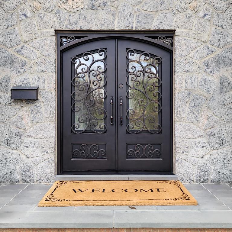 | TUSCANY CUSTOM 10 RH Wrought Iron Door 72 X 96 RIGHT HAND INSWING MEDIUM COPPER Color SANDBLAST Glass STEEL Material PULL HANDLE #020 SQUARE DEADBOLT DOUBLE SQUARE TOP Mediterranean, Spanish, Italianate Style Residential, Commercial (Pull Handles and Locks are price separately) | |