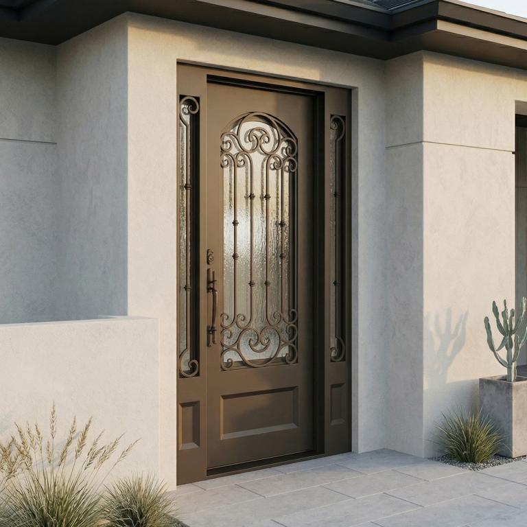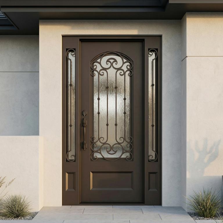 | RIBOTA RH WROUGHT IRON Style 61 X 96 RIGHT HAND INSWING DARK COPPER Color RAIN Glass STEEL Material PULL HANDLE #040 VITO - D107 - BL - S - SINGLE SQUARE TOP Mediterranean, Spanish, Italianate, Religious Style wSidLights, wScreen, Residential, Commercial (Pull Handles and Locks are price separately) | |