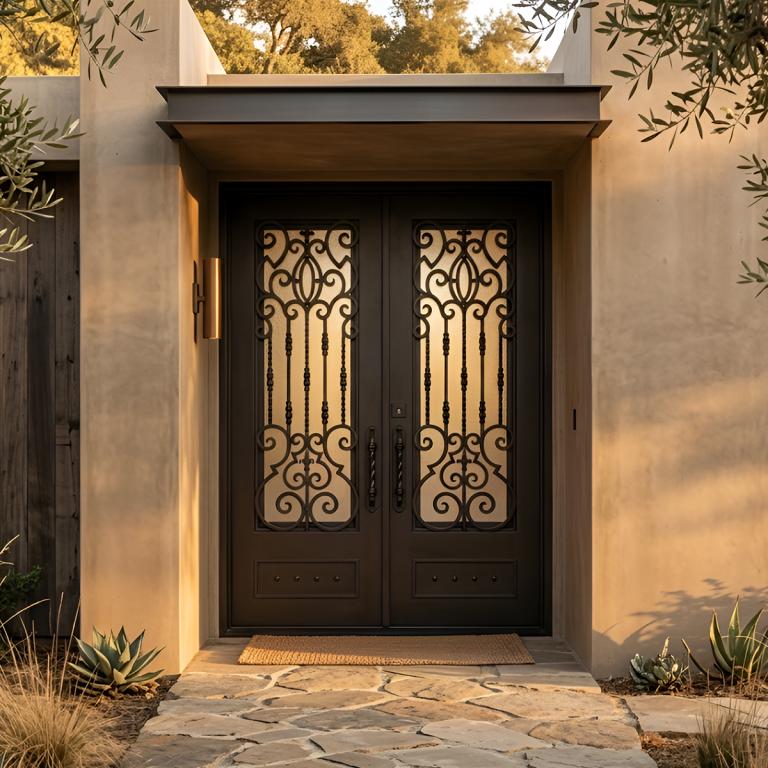 | ANGELINO RH WROUGHT IRON Style 72 X 96 RIGHT HAND INSWING MEDIUM COPPER Color RAIN Glass STEEL Material PULL HANDLE #004 VITO - D107 - BL - S - DOUBLE SQUARE TOP Mediterranean, Spanish, Italianate Style wScreen, Residential, Commercial (Pull Handles and Locks are price separately) | |