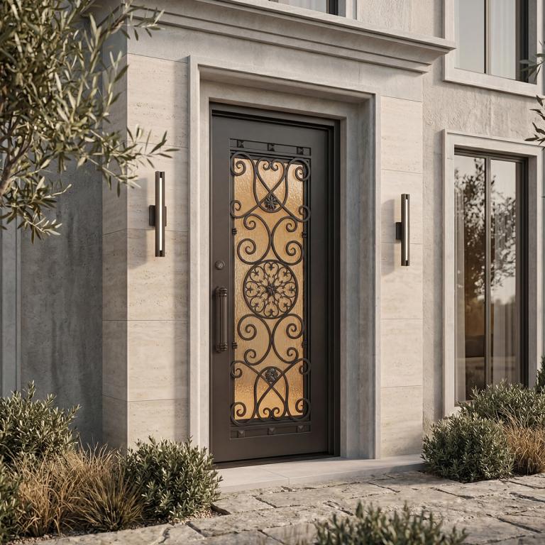 | BELLAGIO RH WROUGHT IRON Style 42 X 96 RIGHT HAND INSWING DARK COPPER Color RAIN Glass STEEL Material PULL HANDLE #025 SINGLE SQUARE TOP Mediterranean, Spanish, Italianate Style wScreen, solid, Residential, Commercial (Pull Handles and Locks are price separately) | |