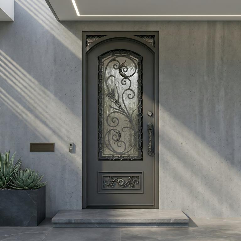 | RENAISSANCE LH WROUGHT IRON Style 42 X 96 LEFT HAND INSWING DARK COPPER Color RAIN Glass STEEL Material PULL HANDLE #019 SINGLE SQUARE TOP Mediterranean, Spanish, Italianate Style wScreen (Pull Handles and Locks are price separately) | |