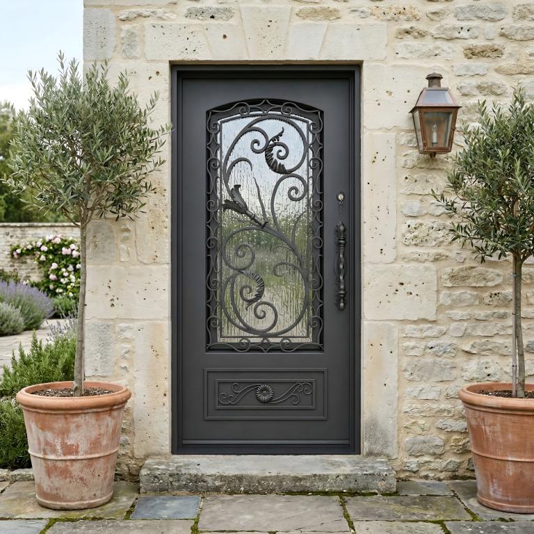 | RENAISSANCE LH WROUGHT IRON Style 42 X 81 LEFT HAND INSWING DARK COPPER Color RAIN Glass STEEL Material PULL HANDLE #019 SINGLE SQUARE TOP Mediterranean, Spanish, Italianate Style wScreen (Pull Handles and Locks are price separately) | |