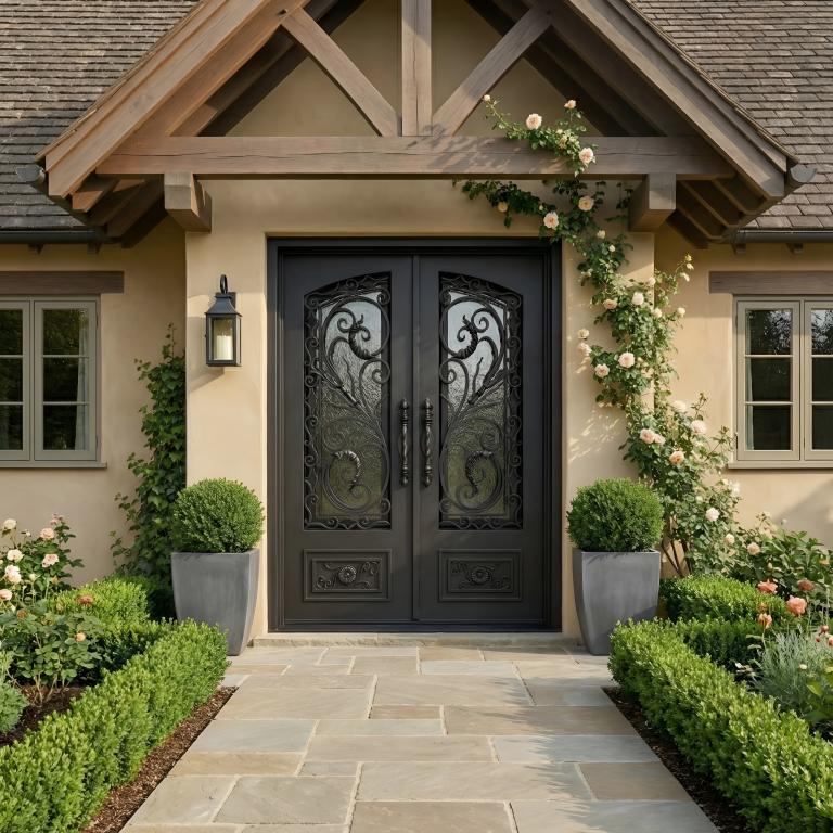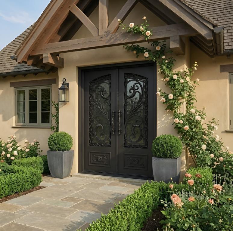 | RENAISSANCE RH WROUGHT IRON Style 61 X 81 RIGHT HAND INSWING DARK COPPER Color RAIN Glass STEEL Material PULL HANDLE #019 VITO - D107 - ORB -S - DOUBLE SQUARE TOP Mediterranean, Spanish, Italianate Style wScreen (Pull Handles and Locks are price separately) | |