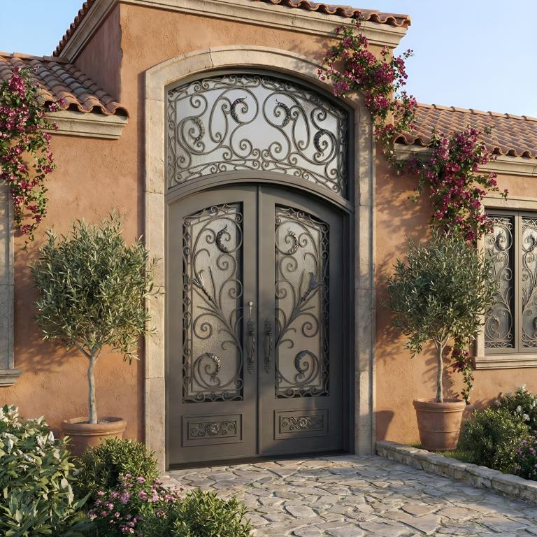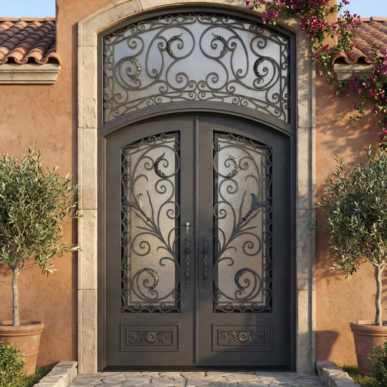 | RENAISSANCE WITH ATTACHED TRANSOM LH WROUGHT IRON Style 72 X 132 LEFT HAND INSWING DARK COPPER Color RAIN Glass STEEL Material PULL HANDLE #019 VITO - D107 - BL - S - DOUBLE EYEBROW TOP Mediterranean, Spanish, Italianate Style wScreen, Residential, Commercial (Pull Handles and Locks are price separately) | |