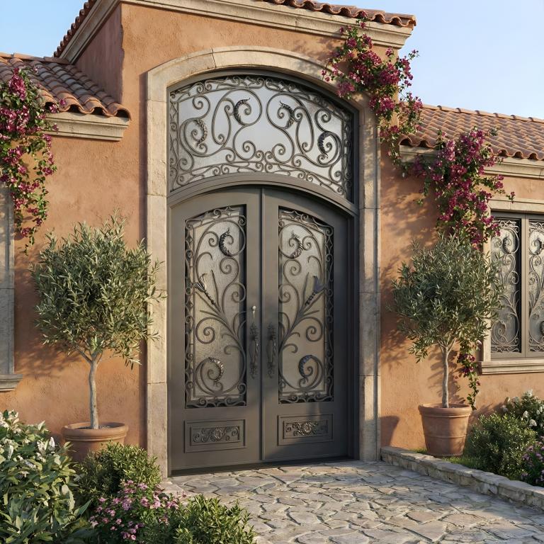 | RENAISSANCE WITH ATTACHED TRANSOM RH WROUGHT IRON Style 72 X 132 RIGHT HAND INSWING DARK COPPER Color RAIN Glass STEEL Material PULL HANDLE #019 VITO - D107 - BL - S - DOUBLE EYEBROW TOP Mediterranean, Spanish, Italianate Style Residential, Commercial (Pull Handles and Locks are price separately) | |