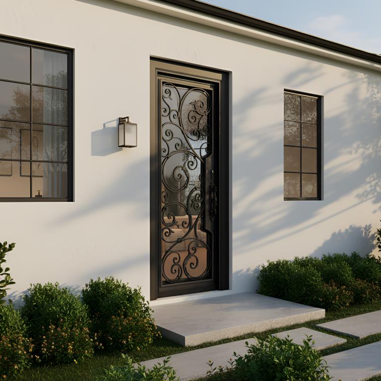 | CHARLOTTE RH WROUGHT IRON Style 37 X 81 RIGHT HAND INSWING FLAT BLACK Color RAIN Glass STEEL Material PULL HANDLE #019 VITO - D107 - BL - S - SINGLE SQUARE TOP Mediterranean, Spanish, Italianate Style wScreen (Pull Handles and Locks are price separately) | |