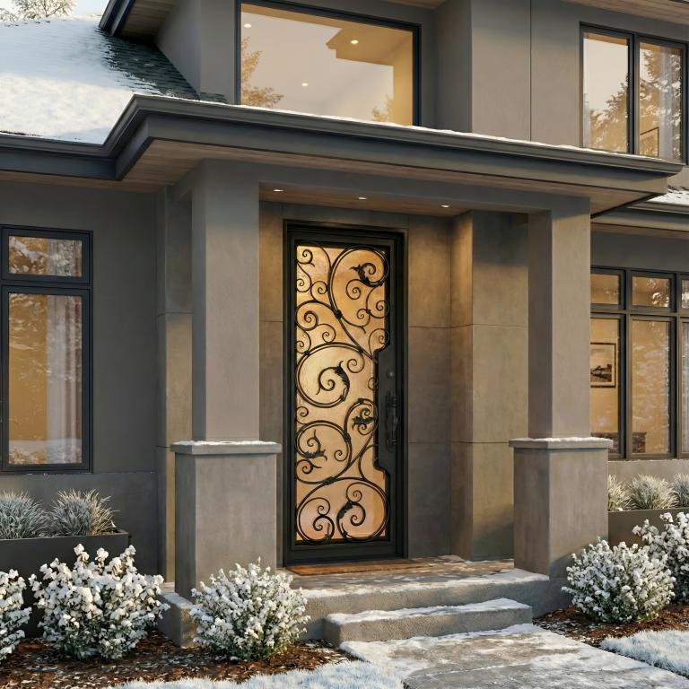 | CHARLOTTE Thermal Break RH WROUGHT IRON Style 37 X 96 RIGHT HAND INSWING FLAT BLACK Color RAIN Glass STEEL Material PULL HANDLE #019 VITO - D107 - BL - S - SINGLE SQUARE TOP Mediterranean, Spanish, Italianate Style wScreen, Thermal Break (Pull Handles and Locks are price separately) | |