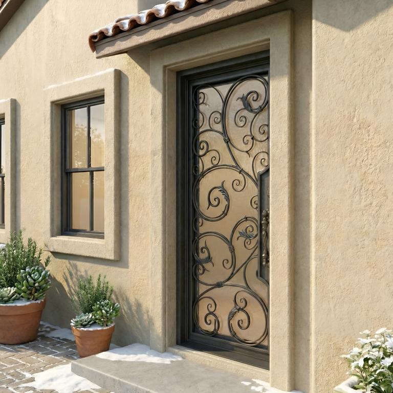 | CHARLOTTE Thermal Break LH WROUGHT IRON Style 42 X 96 LEFT HAND INSWING FLAT BLACK Color RAIN Glass STEEL Material PULL HANDLE #019 VITO - D107 - BL - S - SINGLE SQUARE TOP Mediterranean, Spanish, Italianate Style wScreen, Thermal Break (Pull Handles and Locks are price separately) | |