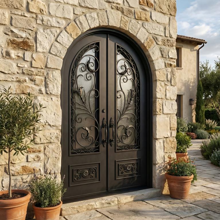 | RENAISSANCE ROUND TOP RH WROUGHT IRON Style 72 X 108 RIGHT HAND INSWING FLAT BLACK Color RAIN Glass STEEL Material PULL HANDLE #019 SIROCCO - D109 - ORB - SINGLE CYLINDER DOUBLE FULL ROUND Mediterranean, Spanish, Italianate Style (Pull Handles and Locks are price separately) | |