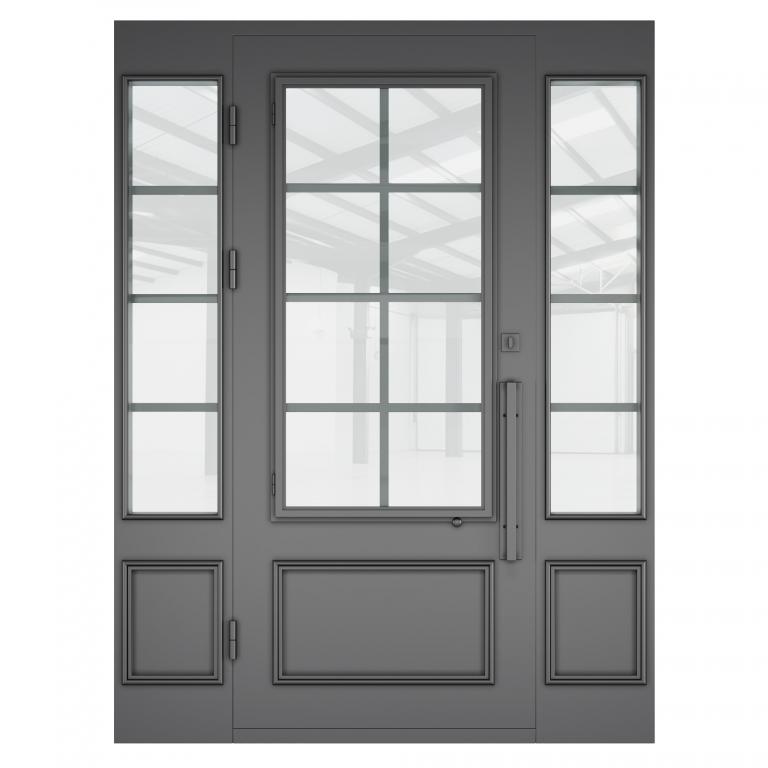 | ESSEX WITH SIDELIGHT THERMAL BREAK RH WROUGHT IRON Style 72 X 96 RIGHT HAND INSWING FLAT BLACK Color CLEAR Glass STEEL Material PULL HANDLE #006 VITO - D107 - BL - S - SINGLE SQUARE TOP Modern, Contemporary Style wSidLights, wScreen, Thermal Break (Pull Handles and Locks are price separately) | |