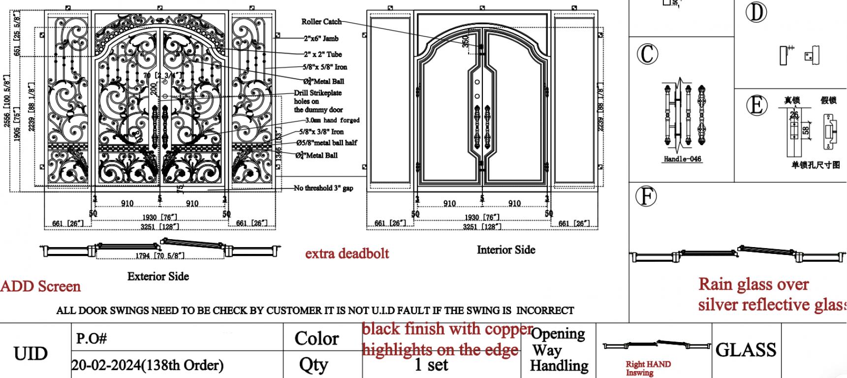 HOVER DOOR WITH SIDELIGHT #R WROUGHT IRON Style 128 X 101 RIGHT HAND INSWING FLAT BLACK Color REFLECTIVE + RAIN Glass STEEL Material PULL HANDLE #046 SIROCCO - D109 - ORB - SINGLE CYLINDER, SIROCCO - D109 - ORB - DOUBLE CYLINDER DOUBLE SQUARE TOP Mediterranean, Spanish, Italianate Style wSidLights, wScreen, special, clearance (Pull Handles and Locks are price separately) |