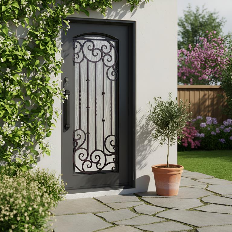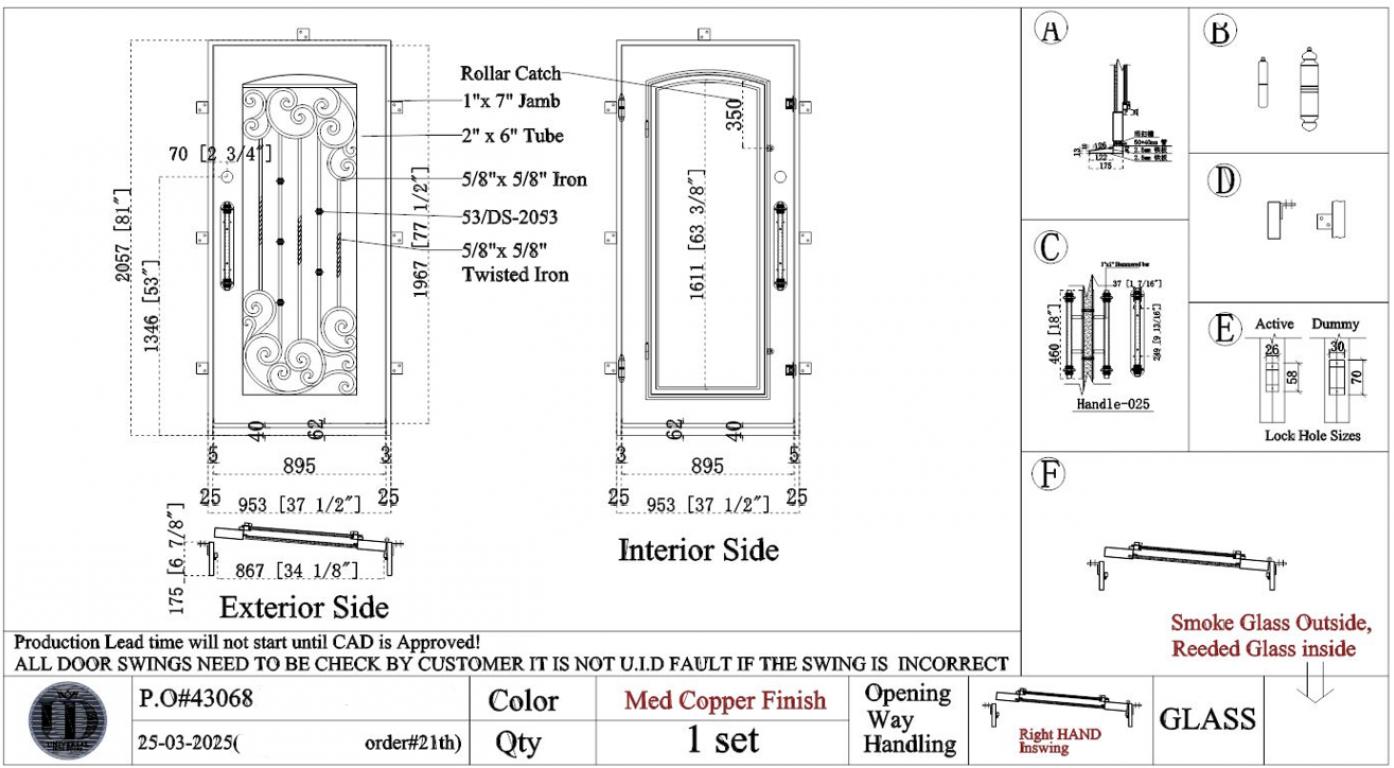 | ELITE RH #R WROUGHT IRON Style 38 X 81 RIGHT HAND INSWING MEDIUM COPPER Color SMOKE OVER REEDED INSIDE Glass STEEL Material PULL HANDLE #025 SIROCCO - D109 - ORB - SINGLE CYLINDER SINGLE SQUARE TOP Mediterranean, Spanish, Italianate Style special (Pull Handles and Locks are price separately) | |