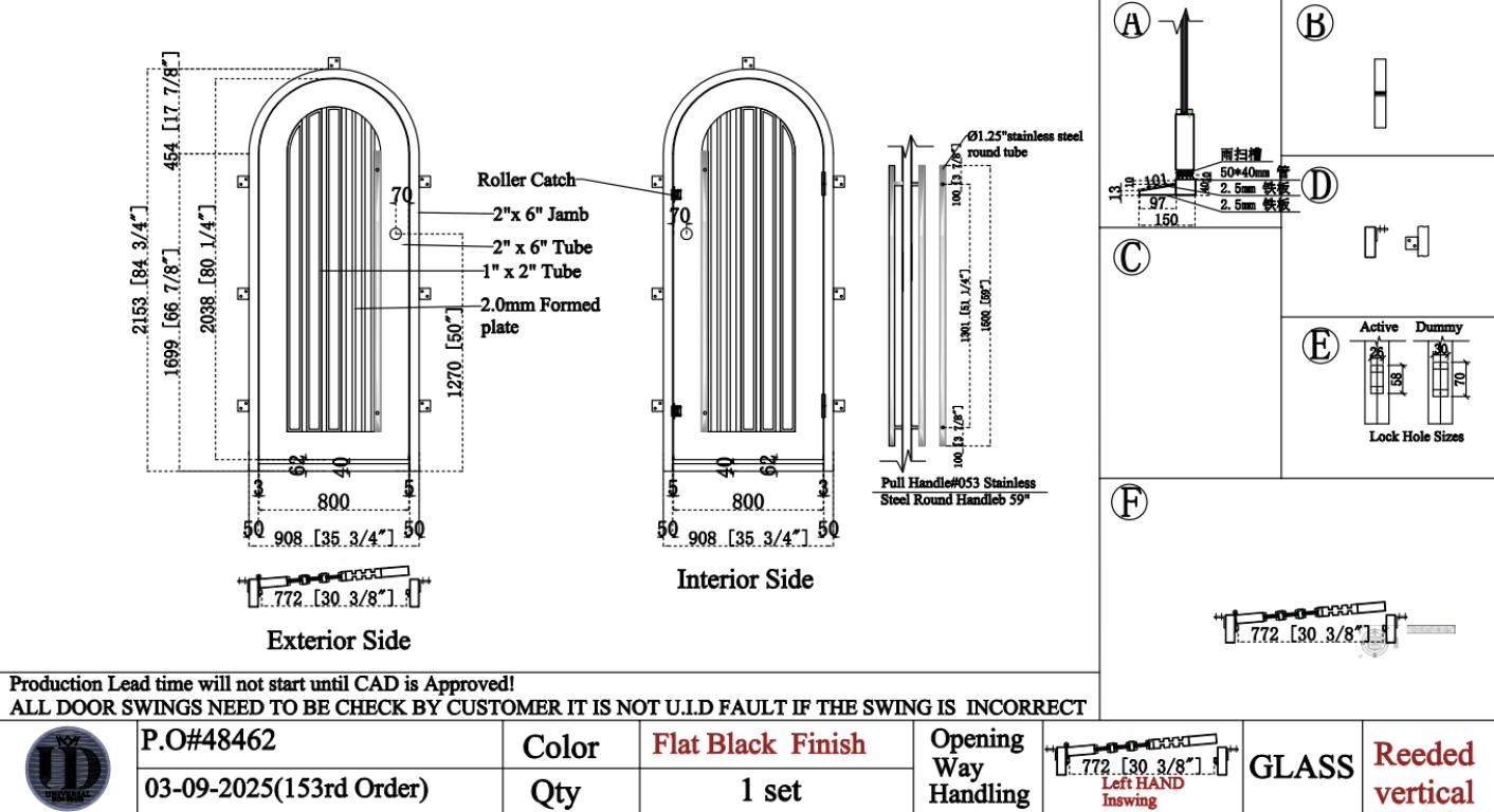 | DOLCE RH #R WROUGHT IRON Style 36 X 85 RIGHT HAND INSWING FLAT BLACK Color REEDED Glass STEEL Material PULL HANDLE #053 STAINLESS STEEL SILVER ROUND 59" VITO - D107 - BL - S - SINGLE FULL ROUND Modern, Contemporary Style (Pull Handles and Locks are price separately) | |
