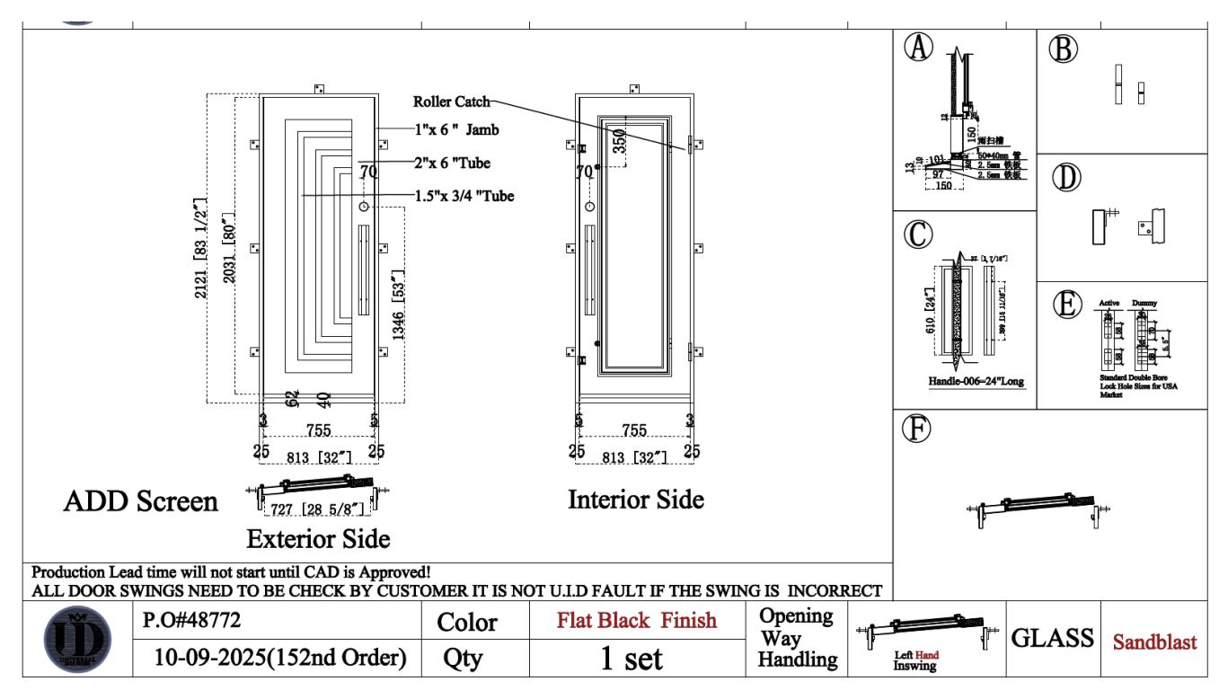 | REFLECTION SQUARE DESIGN LH #R WROUGHT IRON Style 32 X 84 LEFT HAND INSWING FLAT BLACK Color SANDBLAST Glass PULL HANDLE #006 VITO - D107 - BL - S - SINGLE SQUARE TOP Modern, Contemporary Style wScreen (Pull Handles and Locks are price separately) | |