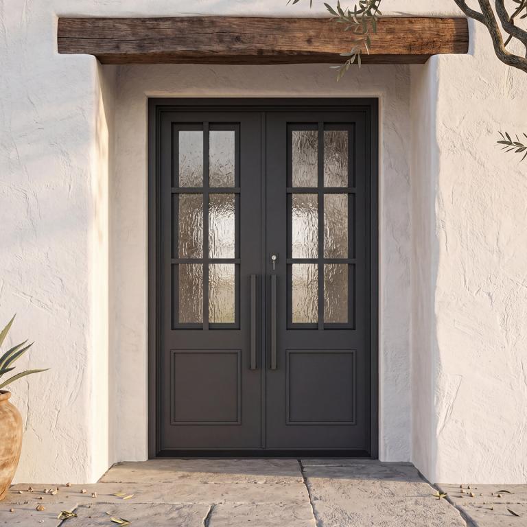 | ESSEX RH #R DARK COPPER WROUGHT IRON Style 61 X 96 RIGHT HAND INSWING DARK COPPER Color RAIN Glass STEEL Material PULL HANDLE #006 VITO - D107 - ORB -S - DOUBLE SQUARE TOP Modern, Contemporary Style (Pull Handles and Locks are price separately) | |