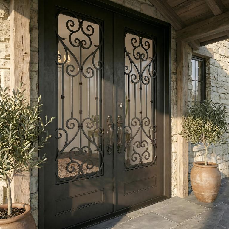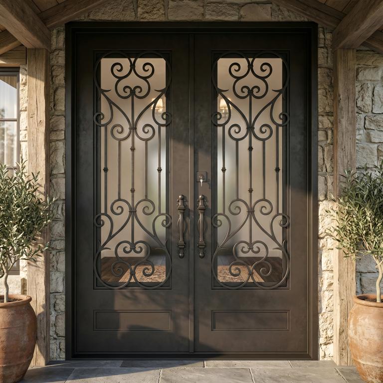 | VATICAN RH WROUGHT IRON Style 72 X 96 RIGHT HAND INSWING MEDIUM COPPER Color SANDBLAST Glass STEEL Material PULL HANDLE #018 VITO - D107 - BL - S - DOUBLE SQUARE TOP Mediterranean, Spanish, Italianate, Religious Style wScreen, Residential, Commercial (Pull Handles and Locks are price separately) | |