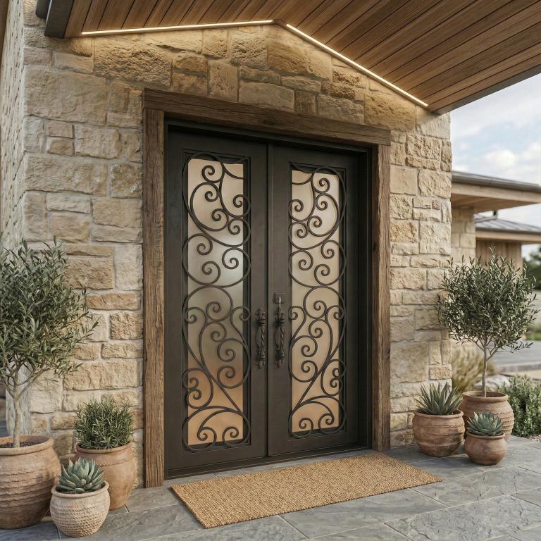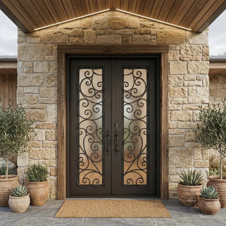 | TUSCANY RH WROUGHT IRON Style 61 X 96 RIGHT HAND INSWING MEDIUM COPPER Color SANDBLAST Glass STEEL Material PULL HANDLE #019 VITO - D107 - BL - S - DOUBLE SQUARE TOP Mediterranean, Spanish, Italianate Style wScreen, Residential, Commercial (Pull Handles and Locks are price separately) | |