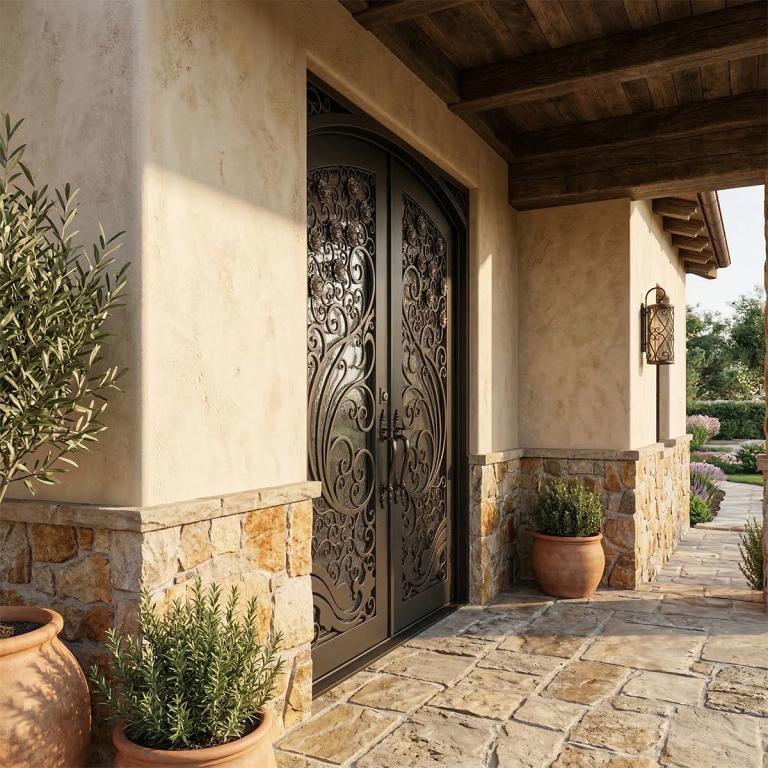| APOLLO RH WROUGHT IRON Style 72 X 96 RIGHT HAND INSWING MEDIUM COPPER Color RAIN Glass STEEL Material PULL HANDLE #020 VITO - D107 - BL - S - DOUBLE SQUARE TOP Mediterranean, Spanish, Italianate Style wScreen, Residential, Commercial (Pull Handles and Locks are price separately) | |